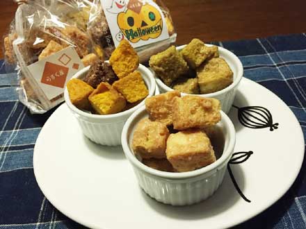 手前から時計回りに、キャラメル・かぼちゃ・青汁。