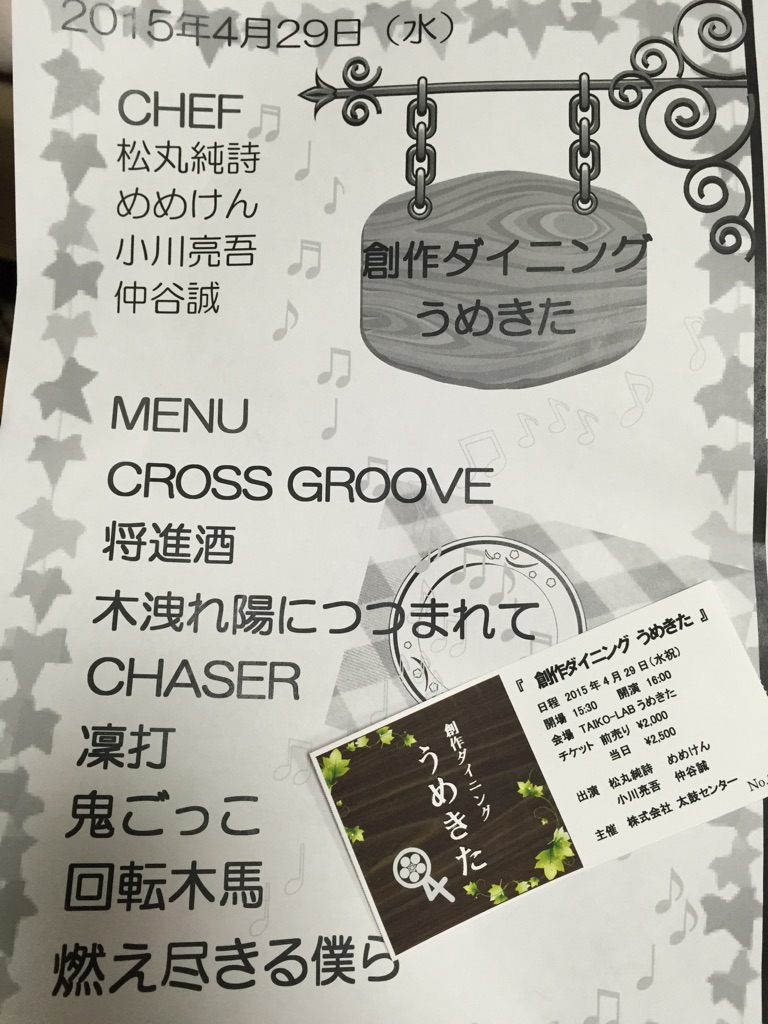 TAIKO-LAB~創作ダイニングうめきたライブ~ 日常 2015年04月29日 こんばんは、深田あさです。 今日は小学校の時の友人、そして今年再開したまーたんに誘ってもらって和太鼓ライブに行ってまいりました! なんとまーたん、細くて凄いかわいらしい~綺麗~な感じの乙女なのですが、パワフルに和太鼓レッスンに通っていた事があるそうな。汗だくで帰っていたらしい。 その時の先生の演奏が聞ける~って事でワックワク! 初めて中津の駅で降りたような気がする。 っていうか中津の駅細すぎん? あまりの細さに感激して写メ撮りまくってました。 阪急中津の高架すぐ下にTAIKO-LABうめきたがあります。 本日のメニュー。 日本の伝統的な楽曲ではなく、創作で出演者の方々は作曲されてます。 『創作ダイニング』っていうタイトルは、曲をお料理に見立ててコースで楽しんでもらうーみたいなコンセプトだそうですよ。 写真OKということでちょっとだけ。 めーーーーっちゃかっこよかった!! まぁもう生の和太鼓がかっこよくないわけないよねー( ´ー`) 普段レッスンで使っている場所でのライブでしたが、すごい迫力。 創作の曲ということで入りやすい。しかし和太鼓ってあんなにいろんな表情が出る楽器なんだなー。おもしろかった! また行きたいし、もっと聞きたかったです! まーたんがやたら体験レッスンを推しているので、いつかやってるかもしれません(笑) そうだ。 まーたんが 「これ見たらフカや!!!と思って」 といってプレゼントしてくれました!友人にも浸透しつつある私の丸メガネキャラ。 超嬉しいかわいいーー!!!!!!! 使うね、使うねー! まーたんありがとう(*´ェ`*) 今日はノーメガネだったのを後悔しました…! ★深田あさ★ [2回] http://asasasasa.blog.shinobi.jp/%E6%97%A5%E5%B8%B8/taiko%EF%BC%8Dlab%EF%BD%9E%E5%89%B5%E4%BD%9C%E3%83%80%E3%82%A4%E3%83%8B%E3%83%B3%E3%82%B0%E3%81%86%E3%82%81%E3%81%8D%E3%81%9F%E3%83%A9%E3%82%A4%E3%83%96%EF%BD%9ETAIKO-LAB~創作ダイニングうめきたライブ~