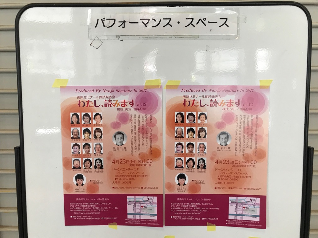 今年も「わたし、読みます」のお知らせ 告知 2017年04月16日 こんばんは、深田あさです。 私は次回で4度目の参加になります 南条ゼミナール朗読発表会 「わたし、読みますvol.12」 まであと一週間になりました。 …。 告知するの忘れてたぁ!(^o^) 過ぎ行く月日のなんと早いこと。 日時:4/23(日)PM1:30~ ※開場は30分前より 場所:ドーンセンター1F・パフォーマンススペース http://www.dawncenter.jp/shisetsu/map.html 大阪市中央区大手前1丁目3番49号 06-6910-8500 京阪「天満橋」駅、地下鉄谷町線「天満橋」駅1番出入口から東へ約350m。 JR東西線「大阪城北詰」駅下車。2番出口より土佐堀通り沿いに西へ約550m。 火星トランプの公演が終わり、気持ち新たに作品に取り組んでおりました。 毎年書いているんですが、「公演」ではなく「発表会」という機会は少し特別です。 プロとしての意識を持ってステージに立つ事は心がけています。 ですが、この場での私は1ゼミ生で、先輩方の、お人柄とか経験とか魂の色が見えるような読みを聞くと、私は薄っぺらいなーと毎年思います。そして恥ずかしくなる。 だからこそ、また立ちます! 豊かな語りがしたい…。 泣いたり笑ったり色んな経験をした1年で、自分はどれだけ育ったか?今年も挑戦です! 今年読む作品、特に事件はおきませーん!!断言したった。 でも好きなタイプの作品です。 大喜びする事がなくても、ちょびっとあったかい気持ちになれる事があれば、その日は良い日だと思える。そんな私が普段着の幸せをお届けします(*´ェ`*) 深田の出演は、中盤の休憩を挟み、ゲストの福島久仁子さんのピアノ演奏、福島弘子さんの朗読の後です。(おおよその時間が分かりましたら追記致します。) ご都合がよろしければ、是非ご連絡下さいませ。 改めてご案内をお送りさせて頂きます。 ★深田あさ★ [0回] http://asasasasa.blog.shinobi.jp/%E5%91%8A%E7%9F%A5/%E4%BB%8A%E5%B9%B4%E3%82%82%E3%80%8C%E3%82%8F%E3%81%9F%E3%81%97%E3%80%81%E8%AA%AD%E3%81%BF%E3%81%BE%E3%81%99%E3%80%8D%E3%81%AE%E3%81%8A%E7%9F%A5%E3%82%89%E3%81%9B今年も「わたし、読みます」のお知らせ