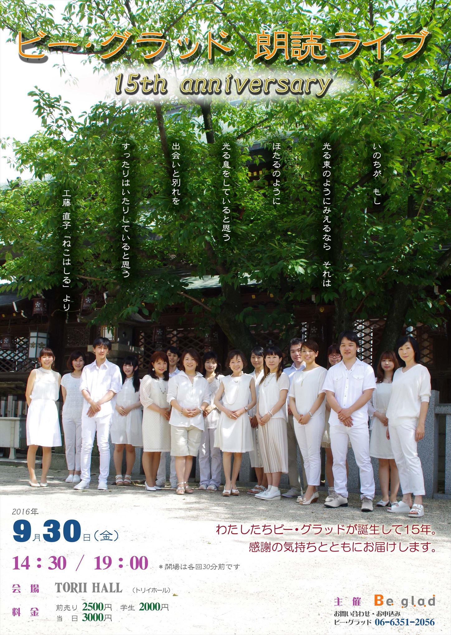所属事務所のイベントに出演します 告知 2016年08月02日 こんにちは、深田あさです。 メンバーが次々告知しているので、あわてて私も第1回告知タイム。 関西のナレーター・声優事務所、弊社ビー・グラッド。 15周年記念朗読liveが開催されます。 「ビー・グラッド朗読ライブ」 【日時】 9/30(金) 昼の部…14:30 夜の部…19:00 【場所】 トリイホール http://www.toriihall.com/access.htm 【チケット】 前売り2500円(高校・専門・大学生2000円) 当日3000円 大好きな作品の大好きな役で出演します。 いつもは1人で朗読していますが、久しぶりに複数で、しかもビー・グラッドのメンバーの皆さんとの作品作り。ありがたや。楽しみです。 是非お越しください。 チケット残数があまりありませんので、先の予定ですがご検討頂けると幸いです。 ★チケットはのお申込みは★ ビー・グラッド:06-6351-2056 深田あさのブログで朗読ライブの告知を見て…とお伝えいただくとスムーズだと思います。 もちろん私への直接のご連絡も大歓迎です! Facebookからのお申込みも対応させて頂きます( ´ー`) 「深田あさ」Facebook https://www.facebook.com/profile.php?id=100007031640991 私うっとうしい顔してますけど、機嫌悪いんとちゃいますからね。 暑かったんや…まぶしかったんや…。 ★深田あさ★ [0回]PR http://asasasasa.blog.shinobi.jp/%E5%91%8A%E7%9F%A5/%E6%89%80%E5%B1%9E%E4%BA%8B%E5%8B%99%E6%89%80%E3%81%AE%E3%82%A4%E3%83%99%E3%83%B3%E3%83%88%E3%81%AB%E5%87%BA%E6%BC%94%E3%81%97%E3%81%BE%E3%81%99所属事務所のイベントに出演します