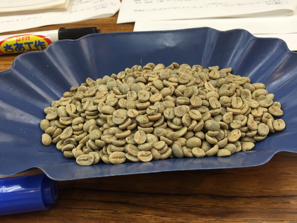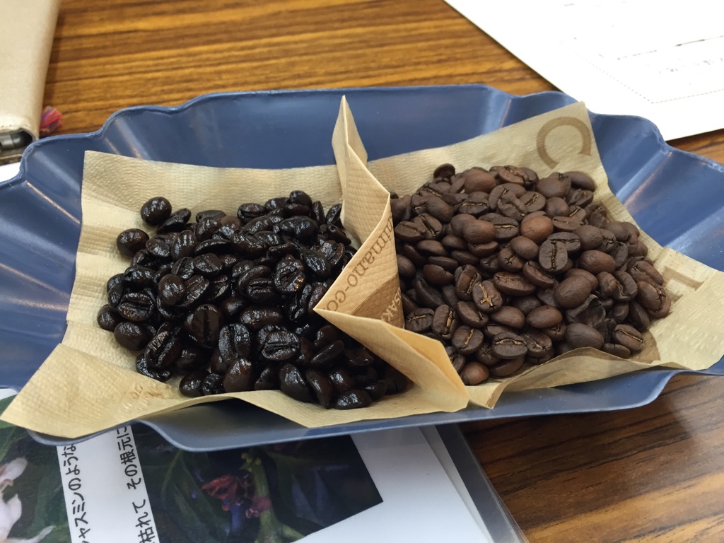 上からコーヒーの生豆(なままめ…と読むんだよ!←クイズ知識)。左が深煎りで右が浅煎り。