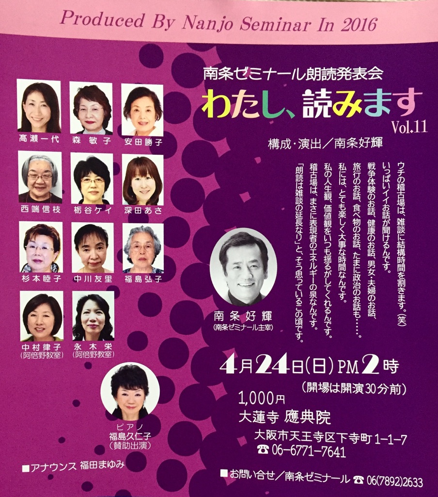 今年も南条好輝先生の朗読ゼミ、「わたし、読みます」vol.11に参加致します。