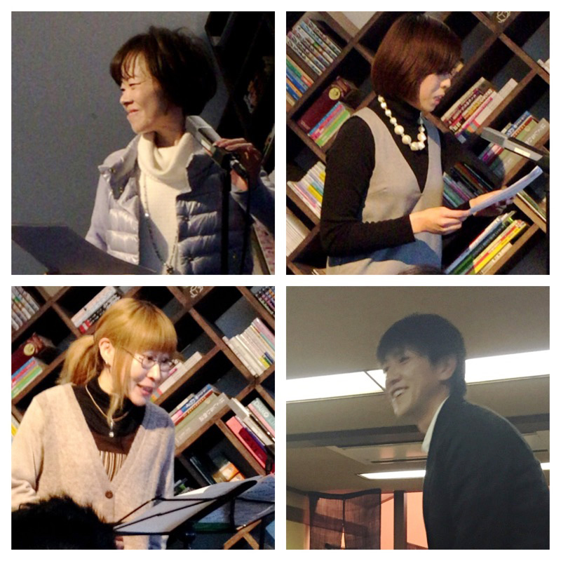 新新新年会・朗読初め! 日常 2016年01月11日 こんばんは、深田あさです。 新年会が続く週末となりました。 まずは、事務所の新年会! そしてFM大阪「大人の文化村」の新年会! 肥ゆる。 まだ正月の蓄積が…でも食べる飲むおいしい楽しい。 なんて事は少しおいておきまして。 「今日乗り越えたら2016年が始まる…」 くらい本日のわたくしは緊張しておりました。 ナレーター・下間都代子さん主宰の 「朗読初め」 下間さん作のちょっとエロスと思いきや…!?という作品。 こちらを15名ほどのナレーターが集まって朗読祭り! 先輩ばかりドッキドキ!! 場所は下間さんがマスターの「うっかりBAR」(月曜にされています) http://2ndlab.net/ 落ち着ける広さです。 ↑のスペースで読ませて頂きました。 緊張している割に、お客様が入る前写メを撮りまくっている私。 を同じ事務所の森上聖子ちゃんに盗撮してもらう。 ビーグラッドチーム。塩見社長、森上ちゃん、私、熊田くん。 熊田くんは自分の出番の直前だったので撮り忘れてました。すまん。 なので新年会の写真です。すまん。 本当に皆様個性的で、めちゃくちゃおもしろかったです! 十人十色とはまさにこの事なんだなーと思いました。 語りってやっぱり楽しい…。 あんな風にしてみたい!とかこんな読み方もあるんや!と発見の連続でした。 自分で選んだものではなく、用意して頂いた作品を読むということ。これも今回私にとって勉強になったなーと思う部分です。 アンコールタイムの大ベテラン様達の共演。 酔っぱらいながら大笑いで聞かせて頂きました。凄かった…‼ 大変ありがたいことに(アゴ外れそうな位慌てましたが)私もアンコールタイムでリクエストを頂戴し、マイクを使っての朗読もさせて頂きました。因みに一回目はマイクなしでテーマは「講談風エセ大河ドラマ」。皆様に温かく見守って頂けてわたしゃ幸せでした。 自分自身の反省点は一杯あるけど、最後までとても楽しかったです。 出演者のみなさま、お客様、そして下間さん、本当にありがとうございました! おうちに帰って 猫その1にTV鑑賞を邪魔され。 猫その2、きみも邪魔するんかい。 すぐ姉キャットのマネしてかわいい。 緊張した心と体がふんわり。 さあー明日っからも色々楽しくがんばっていきます! ★深田あさ★ [2回] http://asasasasa.blog.shinobi.jp/%E6%97%A5%E5%B8%B8/%E6%96%B0%E6%96%B0%E6%96%B0%E5%B9%B4%E4%BC%9A%E3%83%BB%E6%9C%97%E8%AA%AD%E5%88%9D%E3%82%81%EF%BC%81新新新年会・朗読初め!